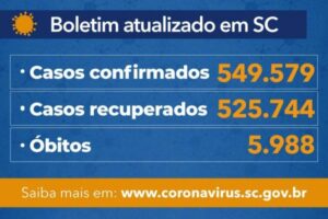 Coronavírus em SC: Estado confirma 549.579 casos, 525.744 recuperados e 5.988 mortes por Covid-19