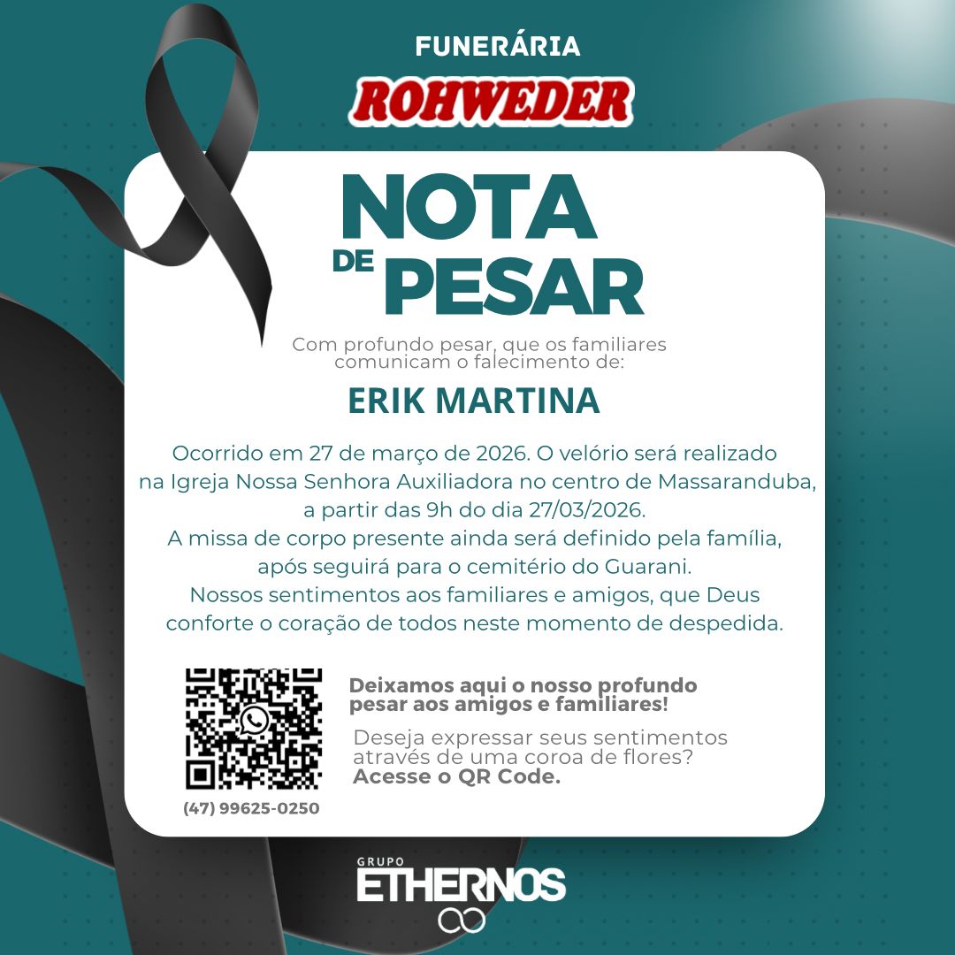 O falecimento ocorreu nesta sexta-feira, dia 27 de março de 2026. A partida de Erik Martina comove familiares, amigos e a comunidade de Massaranduba.