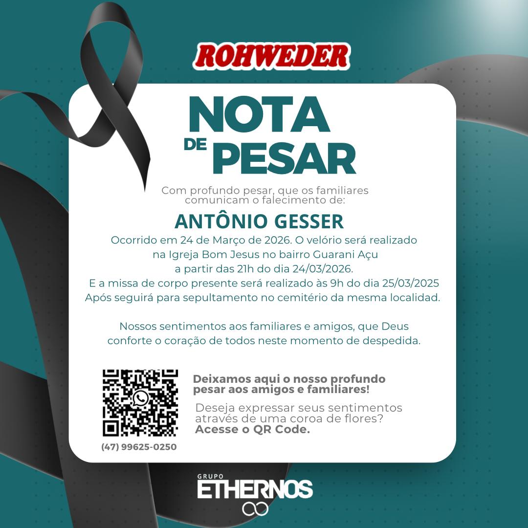 É com profundo pesar que familiares e amigos comunicam o falecimento de Antônio Gesser, ocorrido nesta terça-feira, 24 de março de 2026.