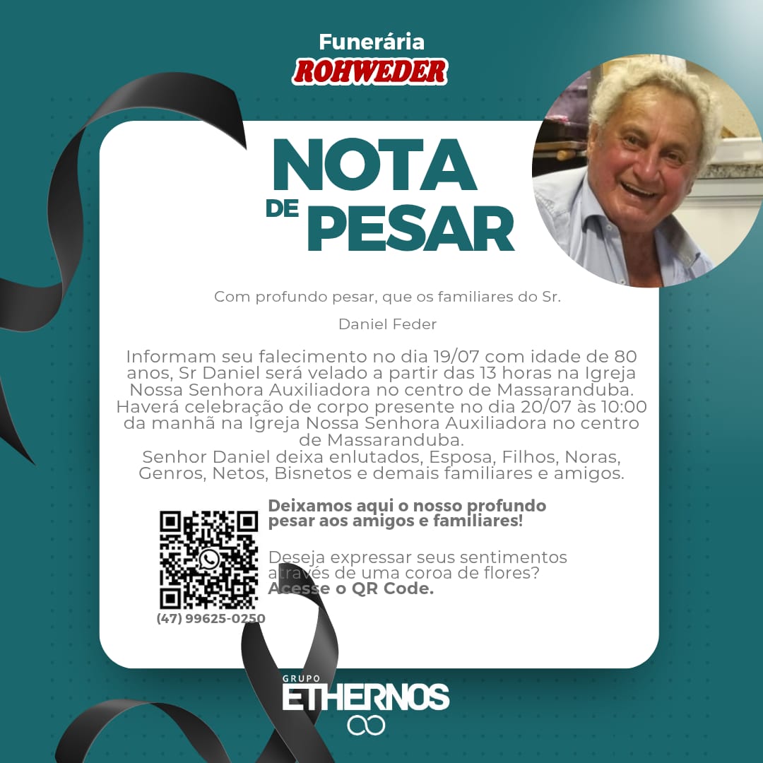 Com profundo pesar, que comunicamos o falecimento do Sr. Daniel Feder com idade de 80 anos, ocorrido dia 19/07.