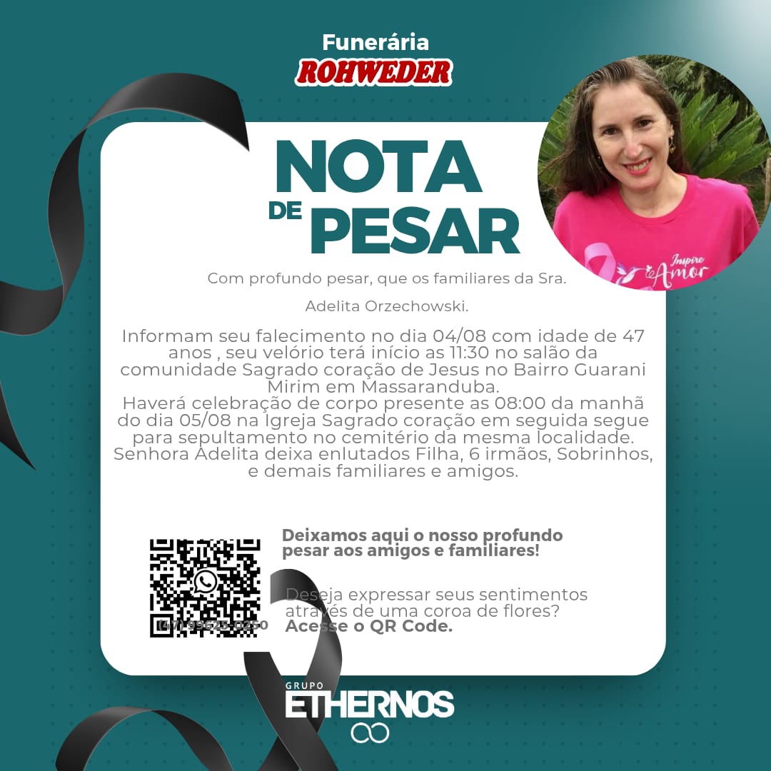 Com profundo pesar, que comunicamos o falecimento do Sra. Adelita Orzechowski com idade de 47 anos, ocorrido dia 04/08.