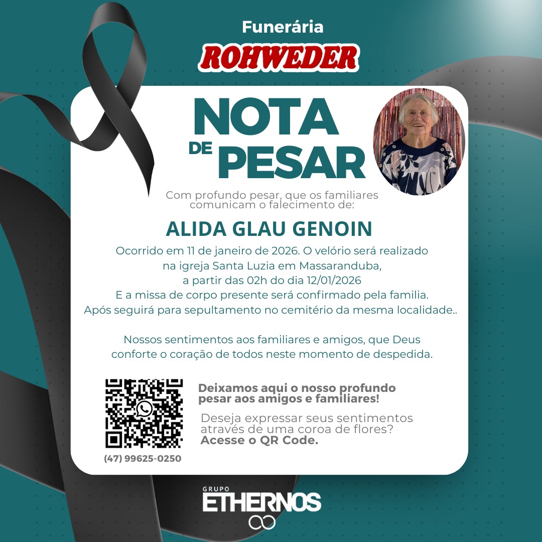 Com profundo pesar, comunicamos o falecimento de Alida Glau Genoin, ocorrido no dia 11 de janeiro de 2026.